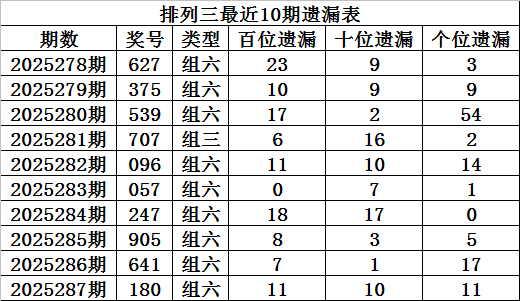 上期追忆:摆列三第2025287期奖号:180,组六,直选遗漏总值为32期。