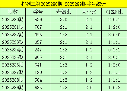 开奖回来:罗列三第2025289期奖号为:685,其奇偶比为1:2,大小比为3:0,奖号012路比为1:0:2。